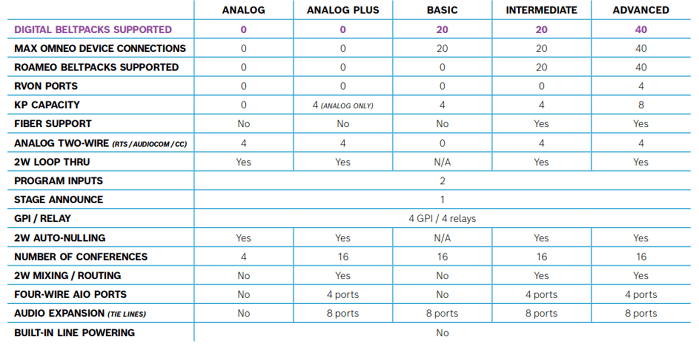 OMNEO Main Station có 05 cấu hình khác nhau, gồm: Advanced, Intermediate, Basic digital (each with OMNEO), Analog Plus và Analog (options for analog-only partyline systems).