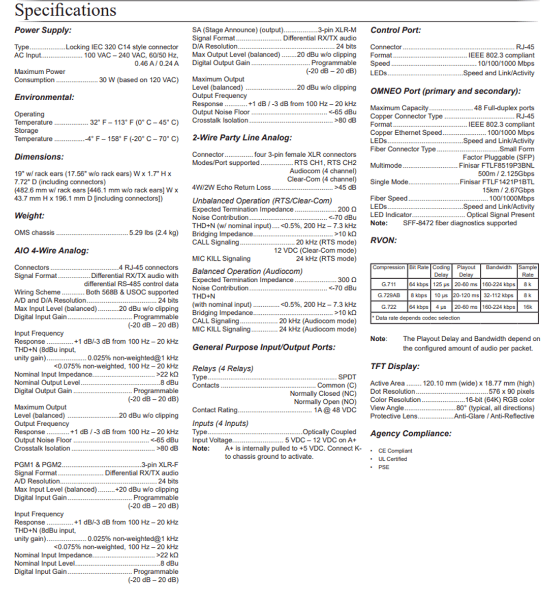 Includes stage announce output and additional OMNEO expansion audio ports reserved for connecting and networking with other OMS units. These expansion ports allow additional system capacity and partyline capability as part of a distributed system
