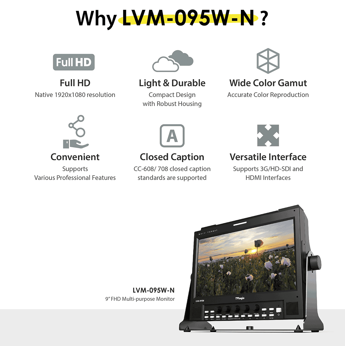 LVM-095W-N 9" mới được phát hành từ TVLogic hiển thị độ phân giải full HD 1920x1080. Nó cũng tương ứng với nhiều nguồn hình ảnh (3G HD/SD-SDI, HDMI) và cung cấp góc nhìn rộng (176 độ). LVM-095W-N được chế tạo từ nhôm để có trọng lượng thân máy siêu nhẹ và giữ V-Mount tích hợp. Được nâng cấp với tấm nền FHD mới có khả năng tái tạo màu sắc trung thực, đáp ứng đúng tiêu chuẩn HDTV, LVM-095W-N cho chất lượng hình ảnh siêu rõ nét cùng các tính năng mạnh mẽ.